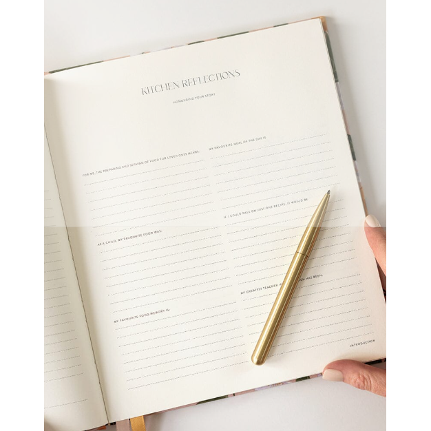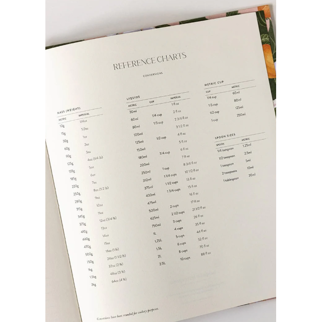 Our recipe books include a Kitchen reflections section (which is beautiful to fill out if buying our recipe book as a gift to hand down your recipes), contents pages, 90 pages for recipes, and reference charts for easy reference for recipe conversions.