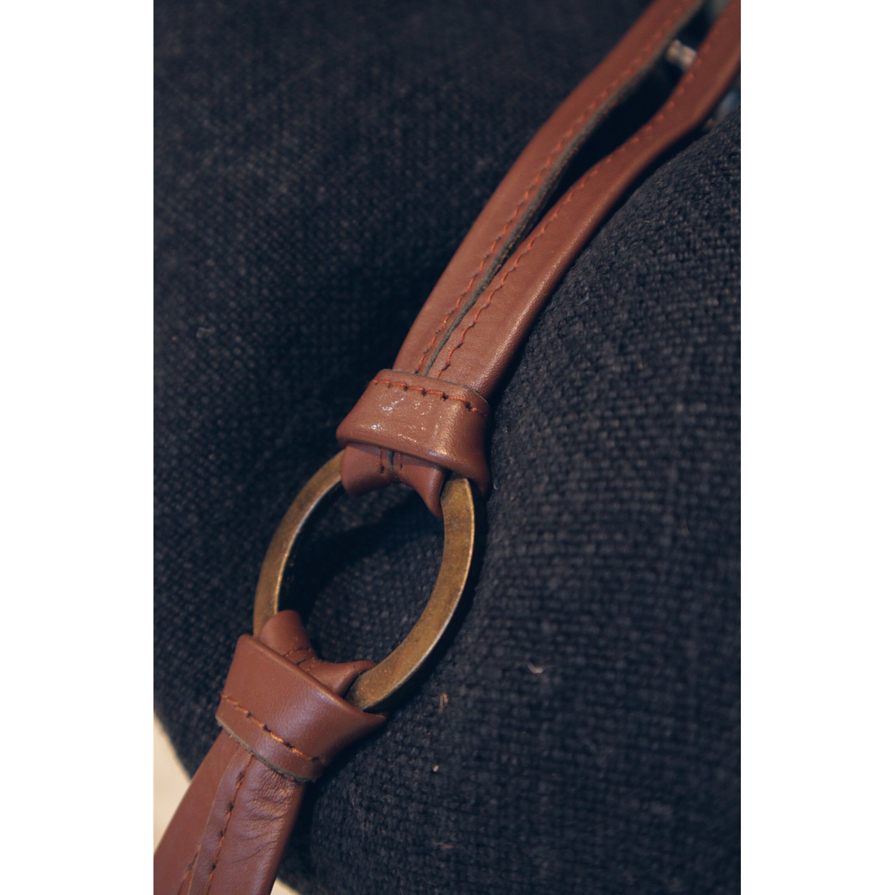 Fold-over leather tie detail, fastened with an antique finish brass ring.